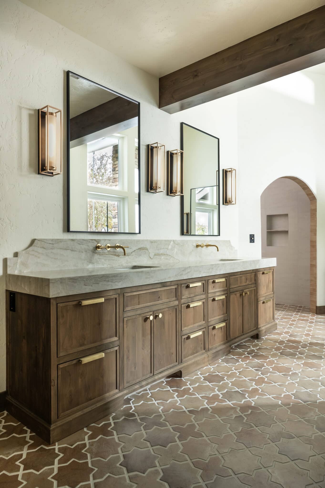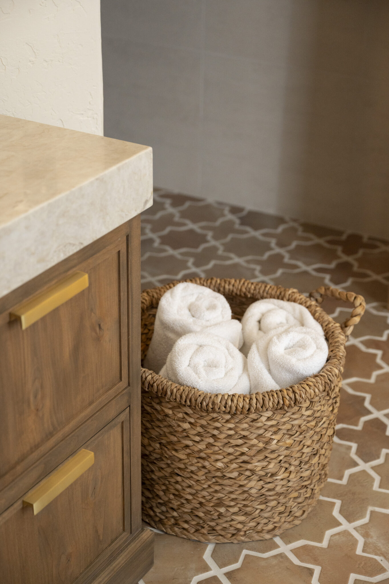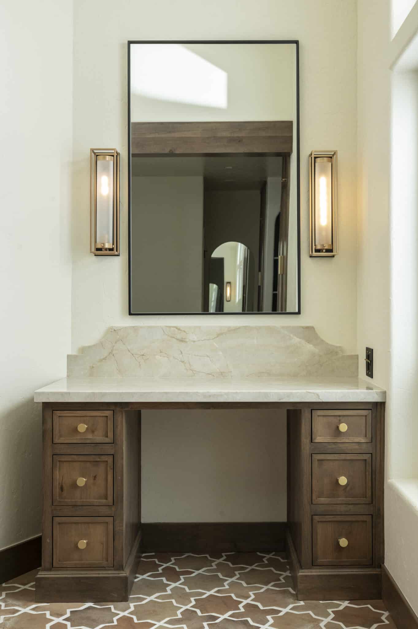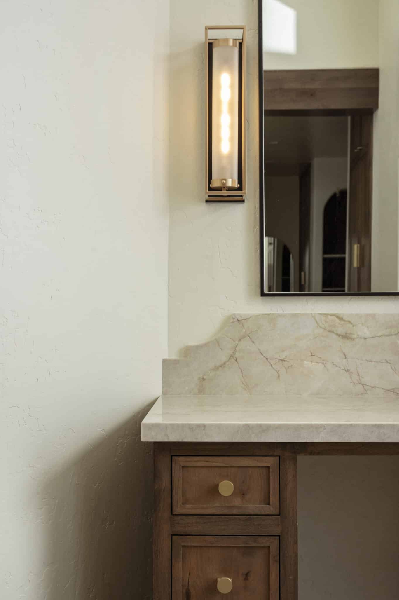 A bathroom designed with intention, where every detail plays a role. Opening up the space by diving into another room allowed for a larger shower and makeup vanity. Taj Mahal stone brings softness and movement, inset cabinetry adds a tailored feel, and warm brass accents tie everything together. Finished with heated porcelain floors for comfort that lasts.